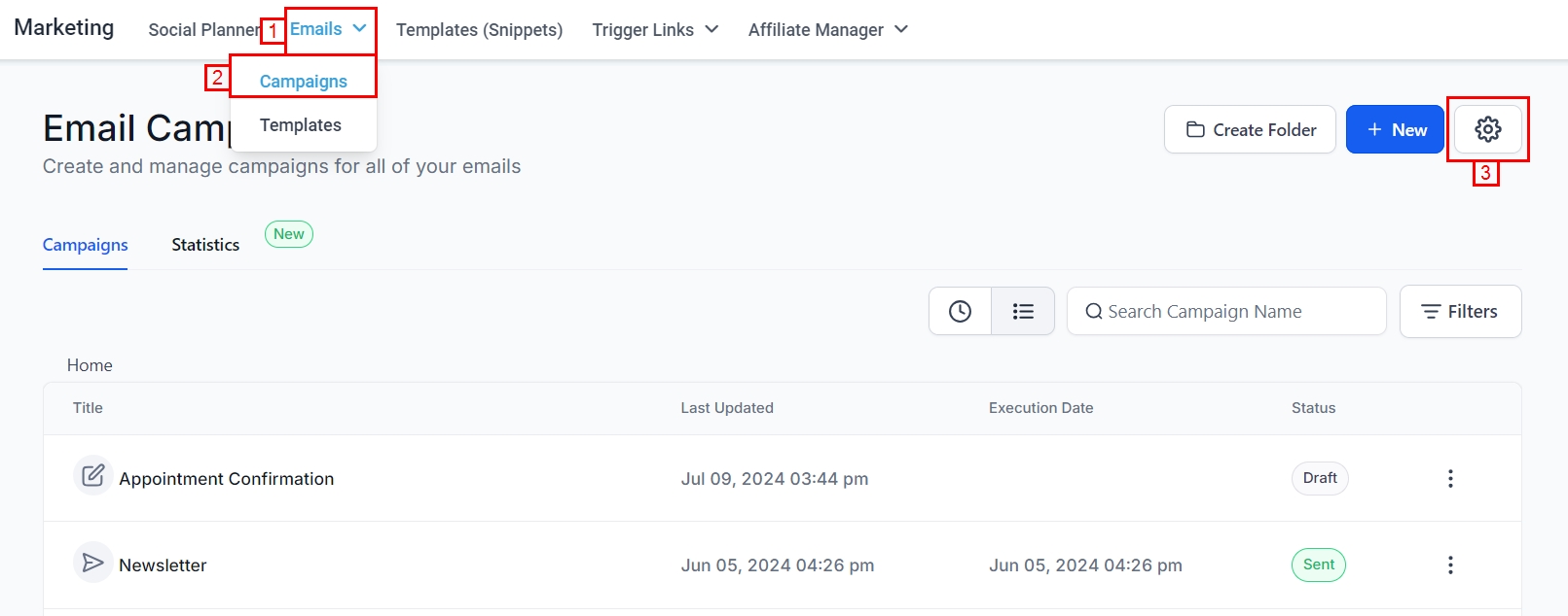 Navigate to the Email Campaigns section under the Marketing tab, and then click the gear icon.