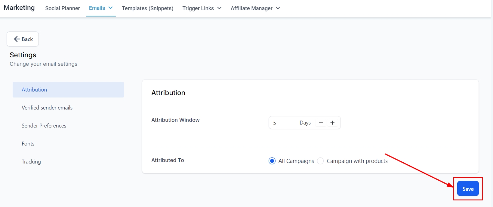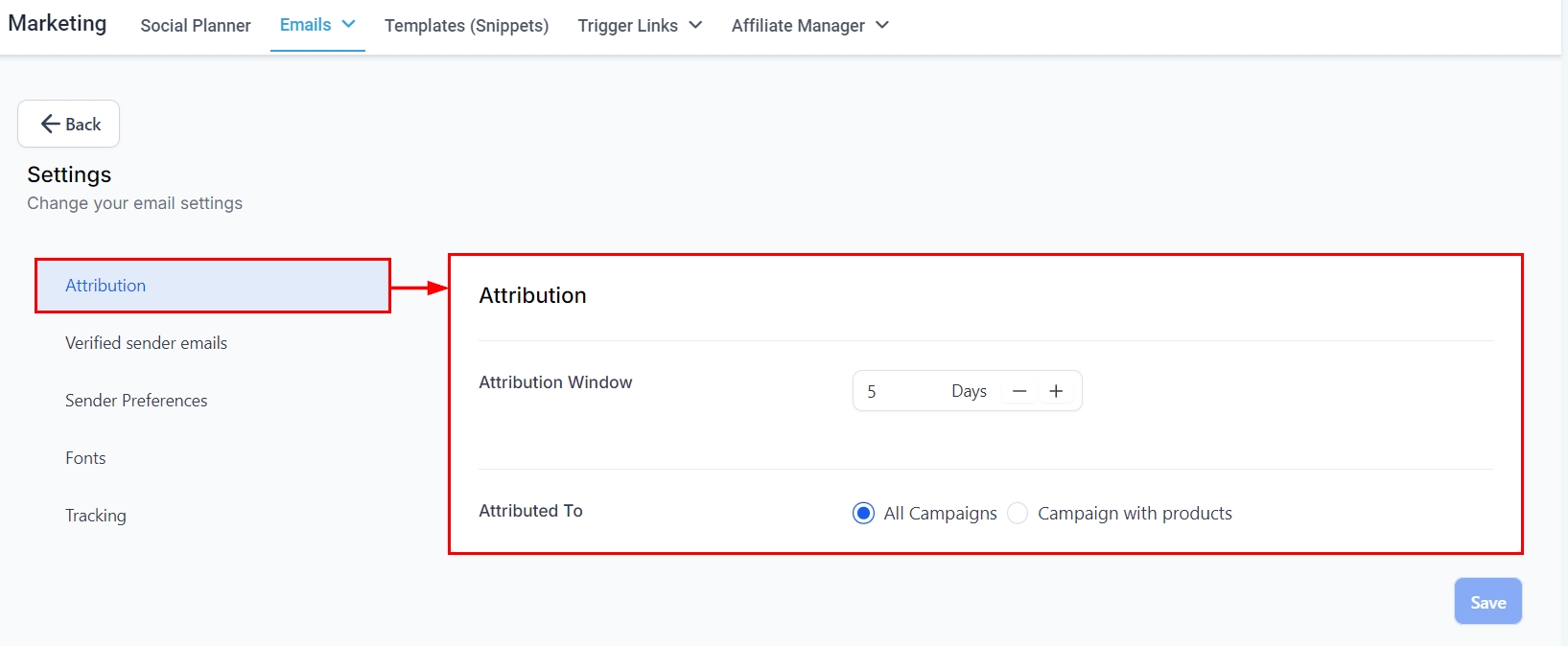This setting determines the maximum number of days a campaign will be eligible for attribution. You can adjust the attribution window by using the "+" or "−" options to increase or decrease the timeframe as needed. Alternatively, you may input the desired number of days directly using your keypad.