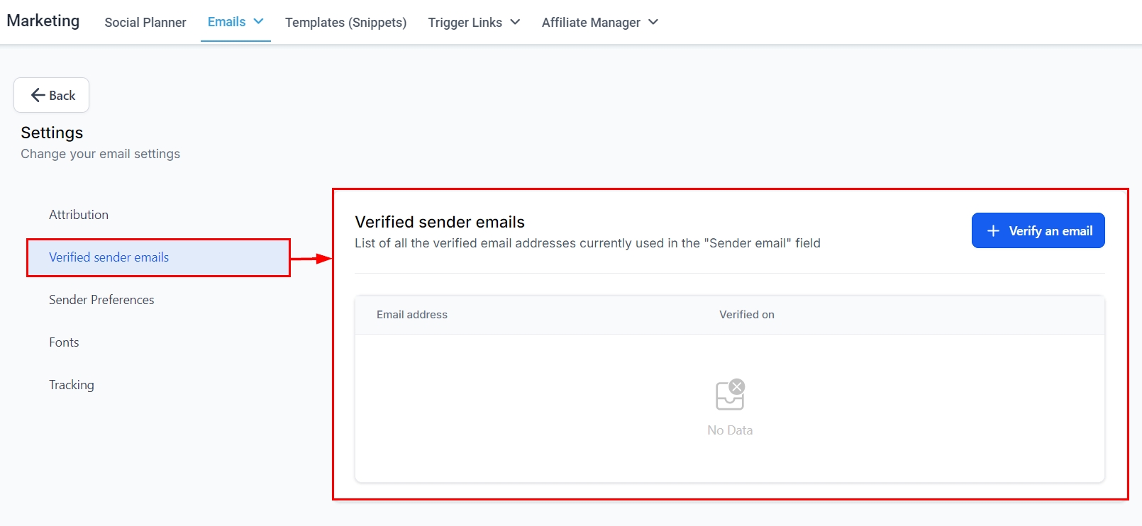 In this section, you can review your existing verified sender emails or add new ones. Verifying your sender emails is essential for ensuring that only authorized users can send emails from your domain. This process safeguards against unauthorized use and helps maintain the integrity and reputation of your brand.