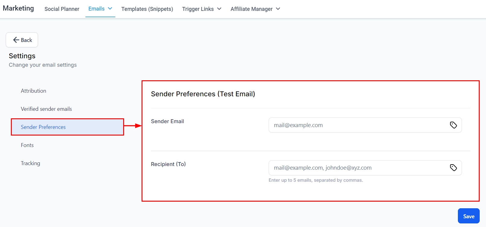 In this field, you can input up to five email addresses for receiving test emails. Separate each email address with a comma, and you may also include custom values as needed.