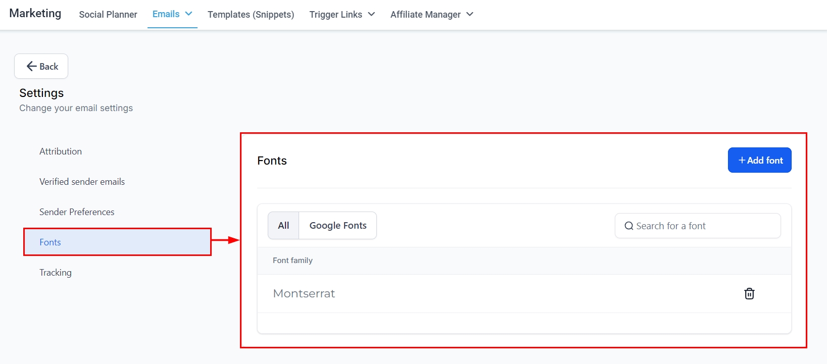 In this section, you can view and manage your Google Fonts. Adding additional fonts allows you to further personalize and enhance the aesthetic of your emails, thereby improving their marketing appeal and aligning them more closely with your brand identity.