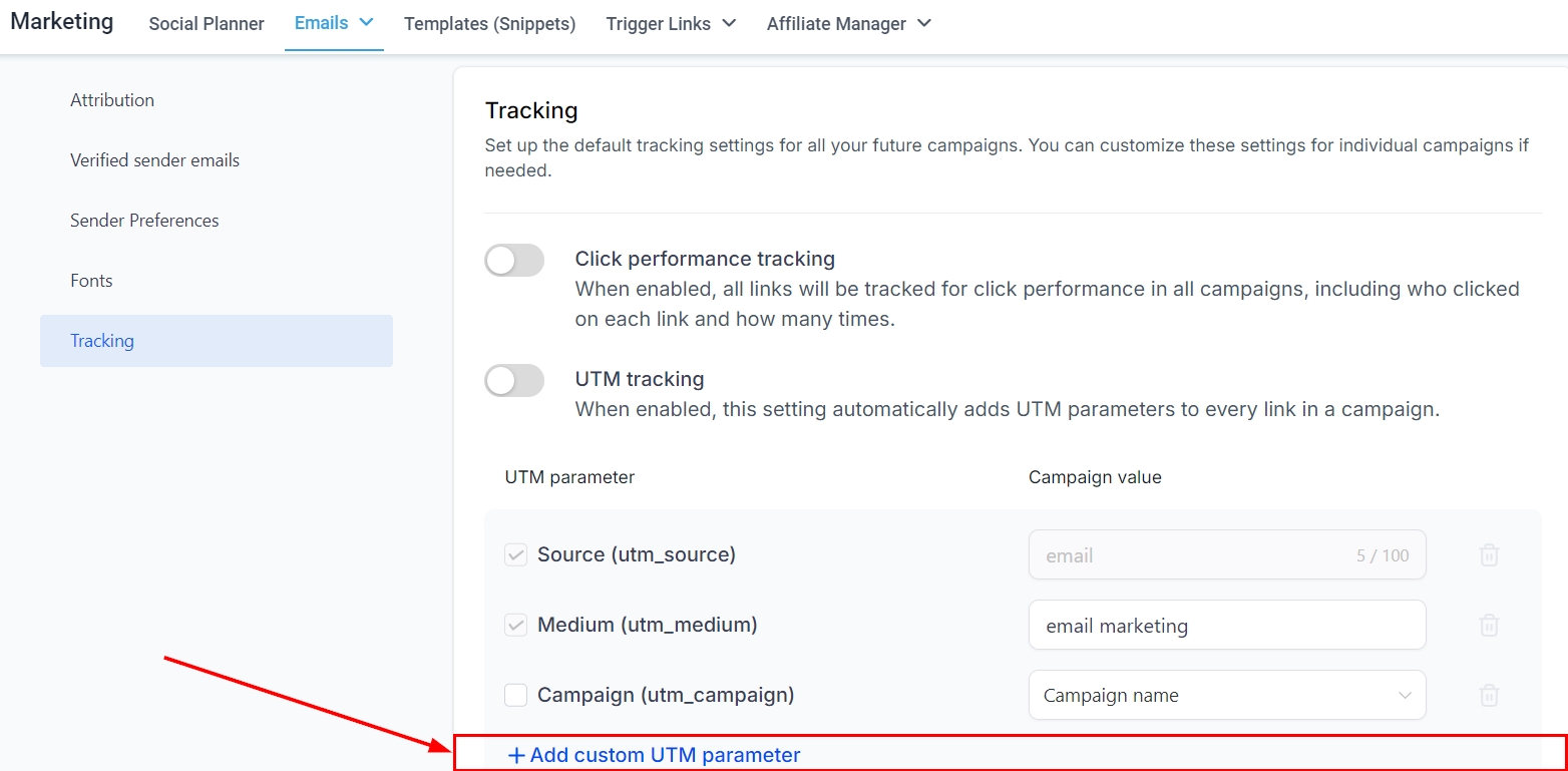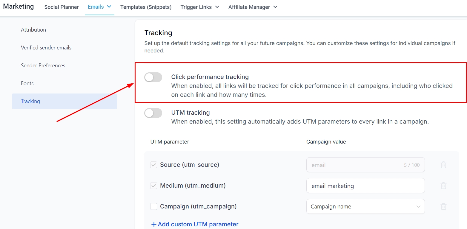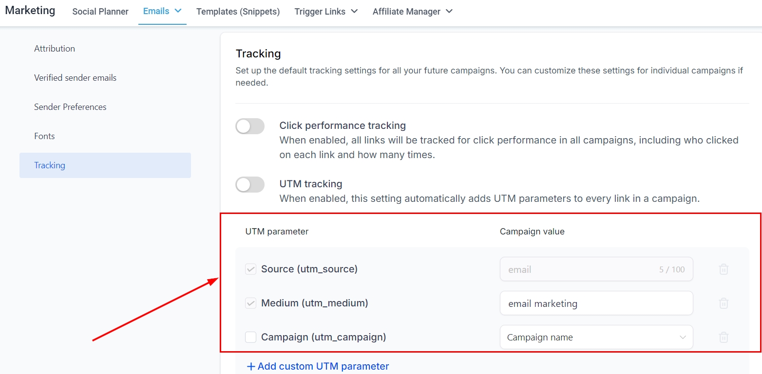 When enabled, this setting automatically incorporates UTM parameters into every link in a campaign.
