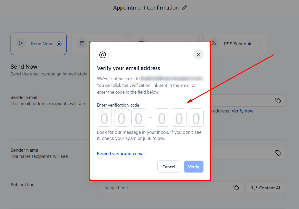 Click the "Verify an email" option within the Verify Sender emails section. This will prompt you to enter the email address followed by the OTP.