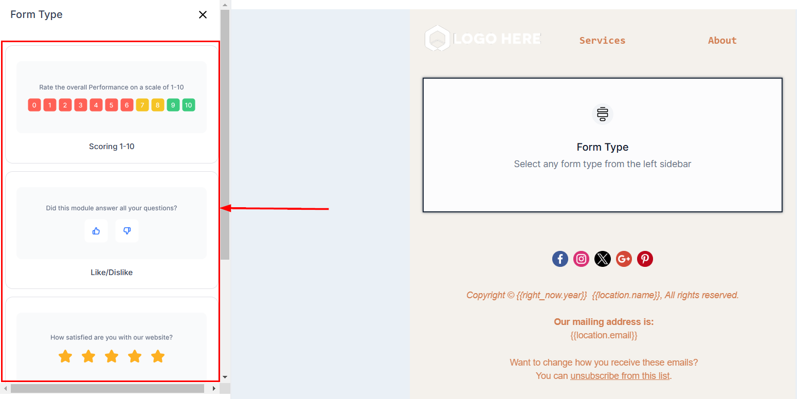 Direct Integration: Embed feedback forms, including NPS, ratings, and like/dislike surveys, within your email campaigns.