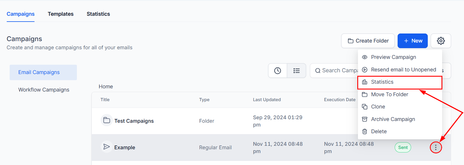 Access the Campaign Statistics from the campaign's action menu to track responses.