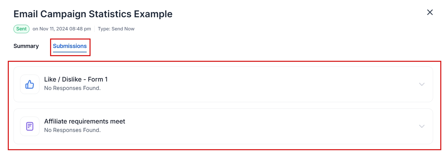 Within the Submissions tab, you can view all form submissions received from the email, with the option to export respondent lists for further analysis.