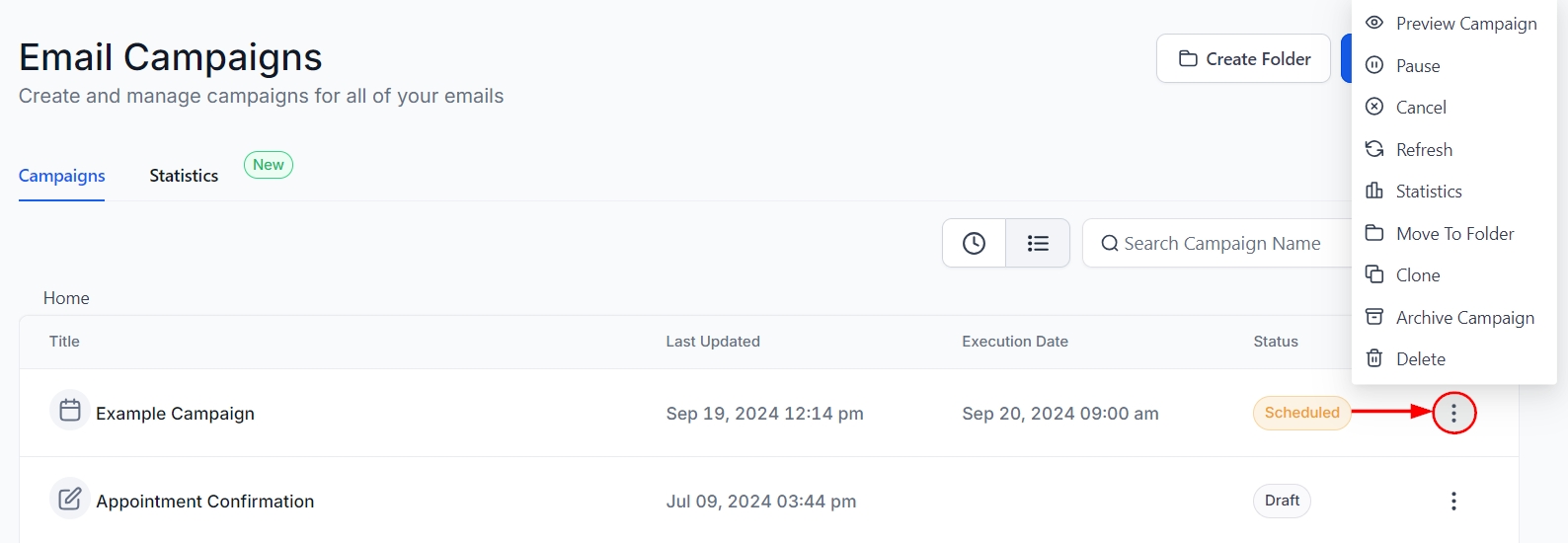 Find the campaign under the "Scheduled" status, then click on the three dots (menu icon) next to the scheduled campaign.