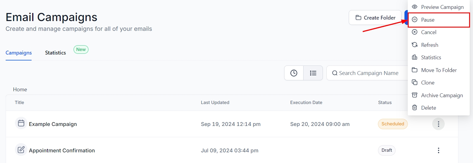 Pause a Campaign: If you need more time to review or make adjustments before your campaign is sent, pausing the campaign allows you to temporarily stop it.