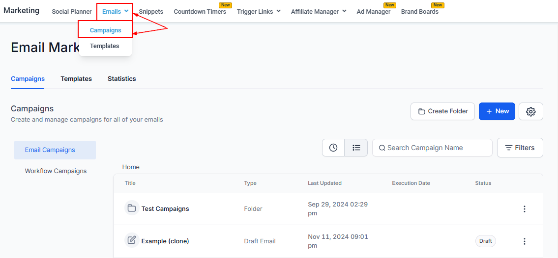 Navigate to the Marketing tab on the left menu, then select "Emails" followed by “Campaigns”.