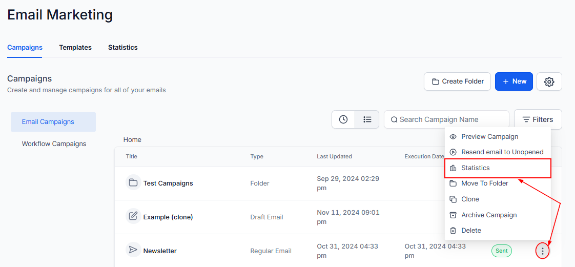 Click on the three dots next to the campaign, then "Statistics" from the actions menu.