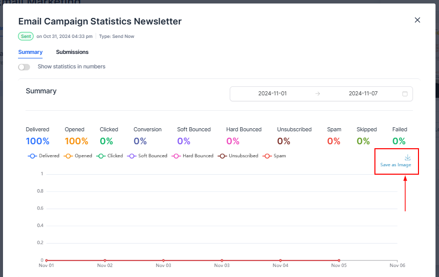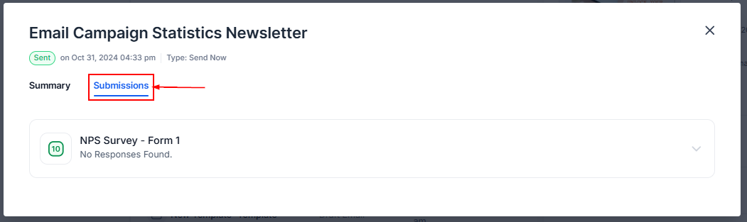 In the Submissions tab, you can check for detailed entries received from the Form & Inline Survey Element in your Email Campaign.