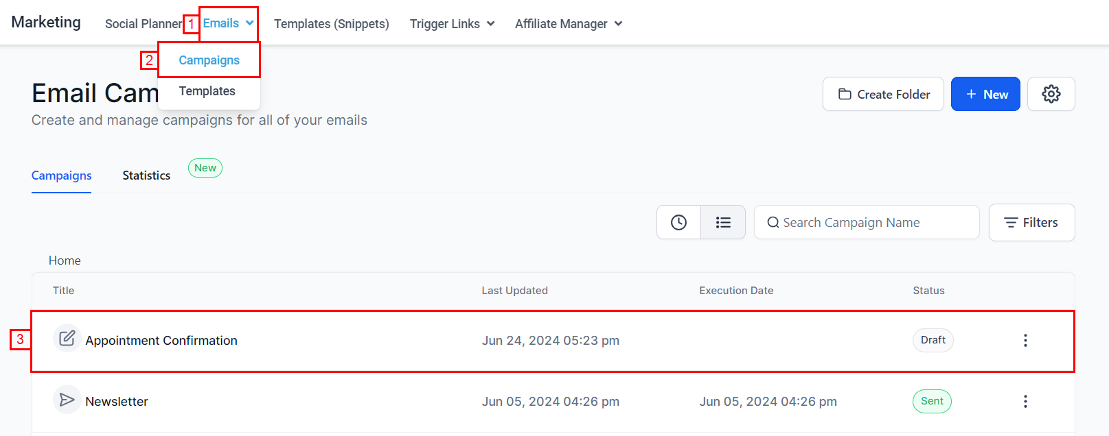 To begin, navigate to an existing campaign or create a new campaign within the Marketing > Emails > Campaigns section.