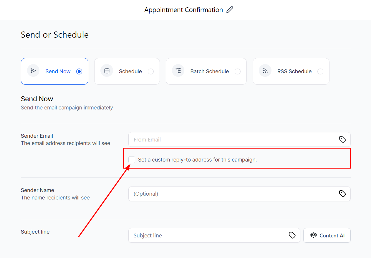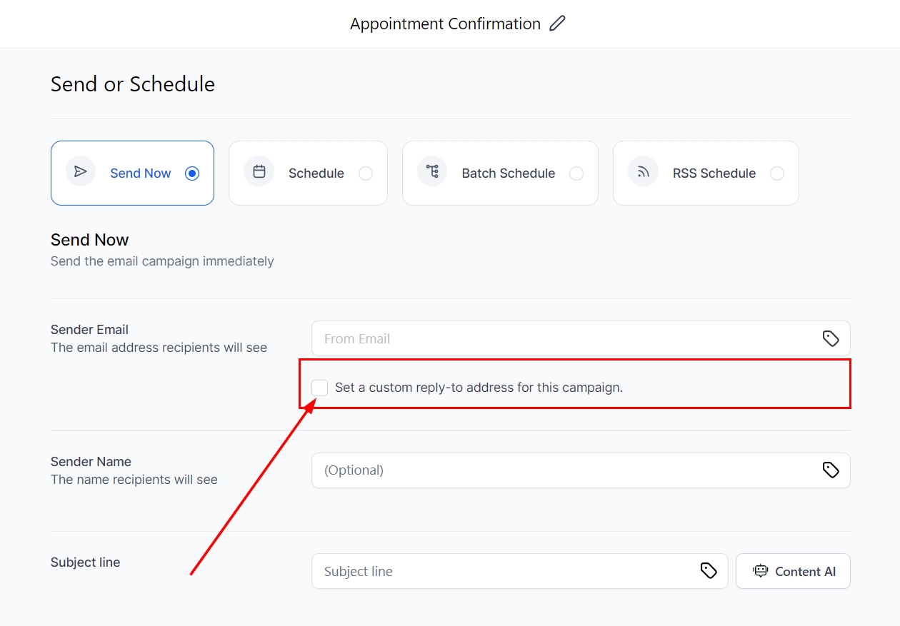 1. Custom Reply-To Address: Set in the campaign’s Send or Schedule screen.