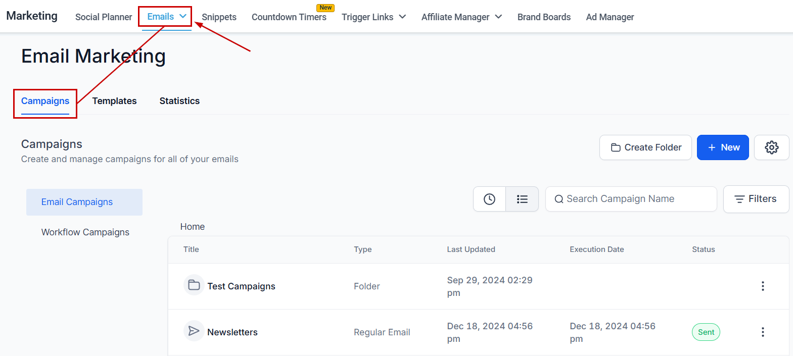Start by navigating to the Campaigns area of your Emails tab inside the Marketing section.