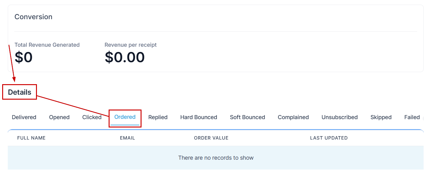 In the conversion section, you'll find "Total Revenue Generated" and "Revenue per Receipt". This provides a snapshot of your campaign's financial impact.