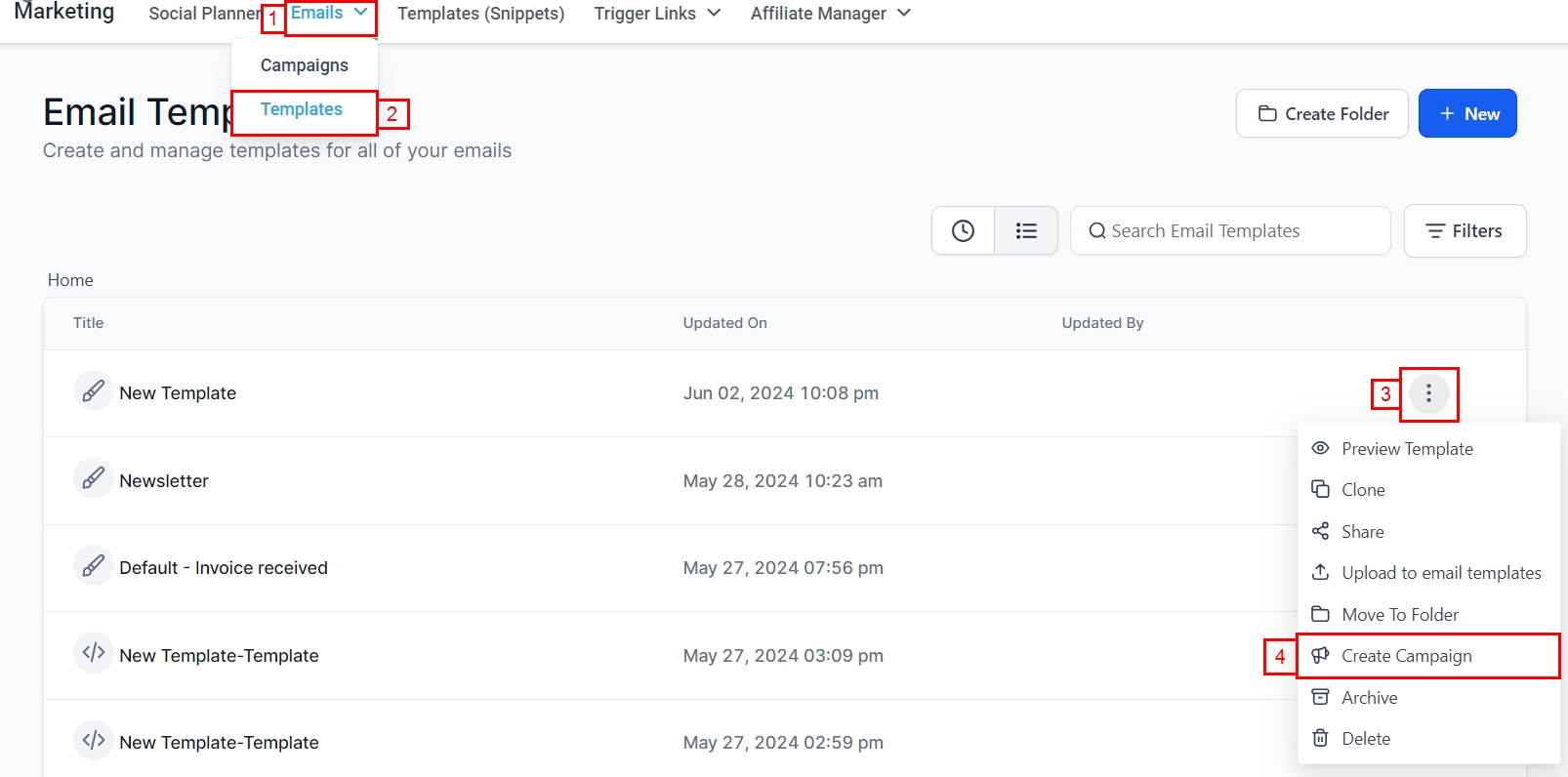 Go to Marketing Tab: On the left sidebar, navigate to the 'Marketing' tab and then to 'Email Templates'.