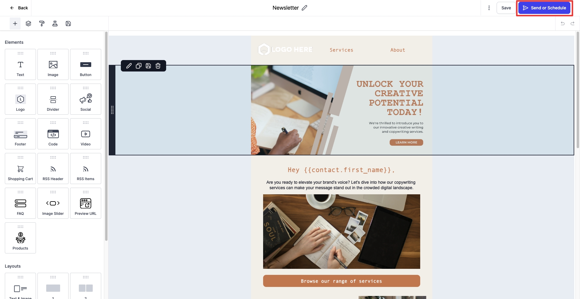 Schedule Your Newsletter: Click on 'Send or Schedule' in the top right. Choose when you'd like to send out the newsletter and fill out the sender information, email subject, and recipients. Under 'Recipient', choose 'Send to Smart List' and select the smart list you created.