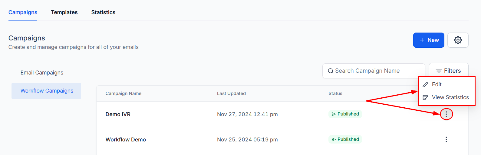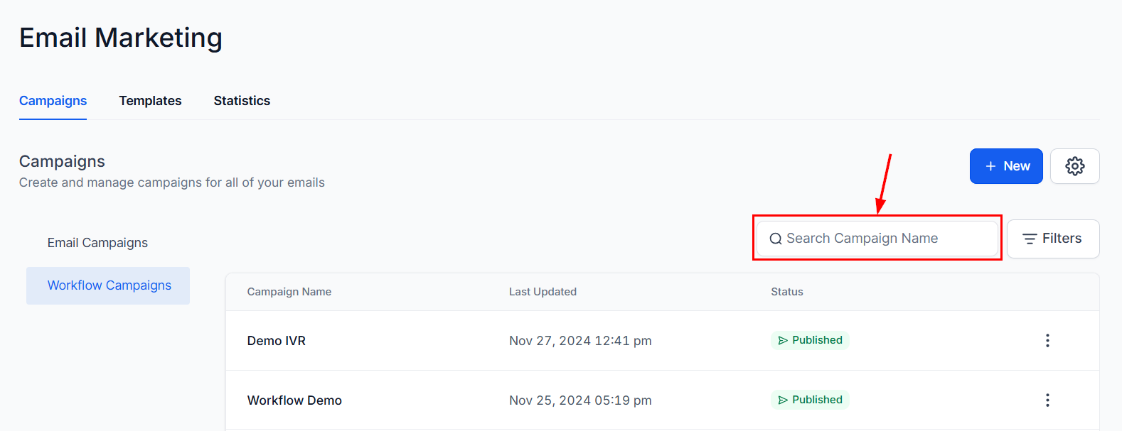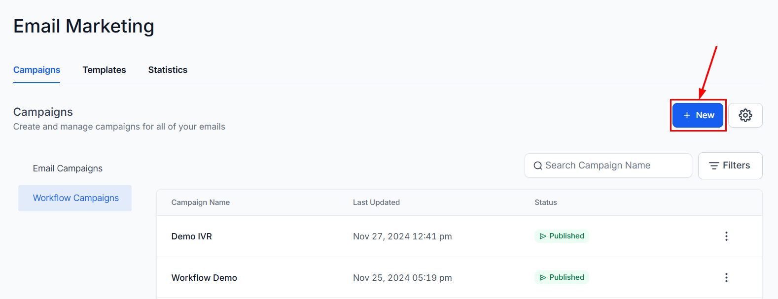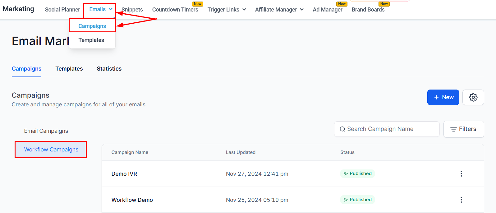 To access this feature, navigate to the Email Campaigns section in your account, then click the Workflow Campaigns option.