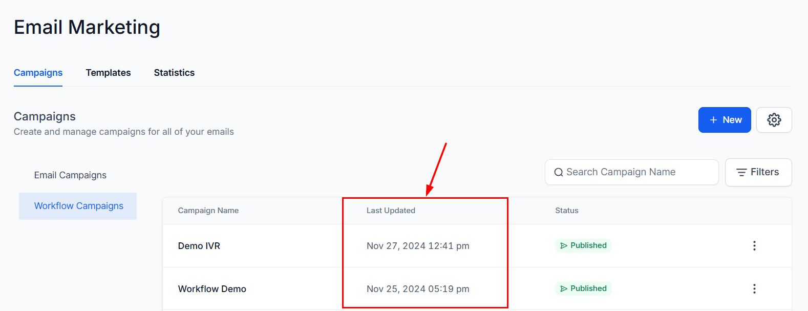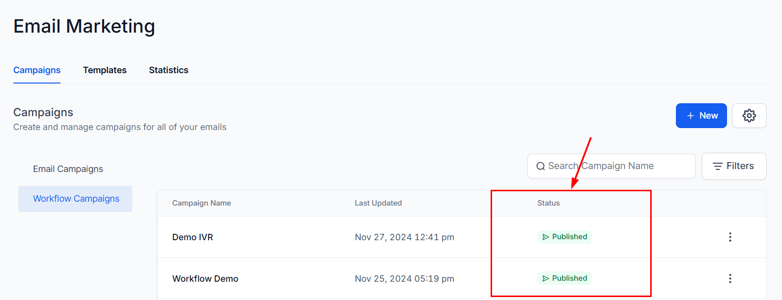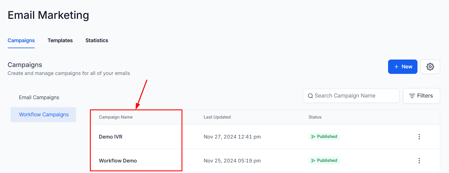 The Campaign Name column displays the name given to the workflow, allowing you to identify it easily.