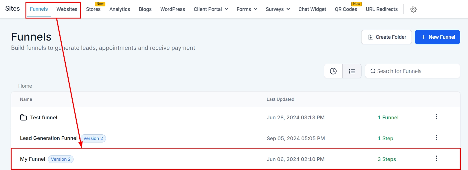 Navigate to the Sites tab to manage your funnels or websites, and choose the specific funnel or website where you intend to add the countdown timer.