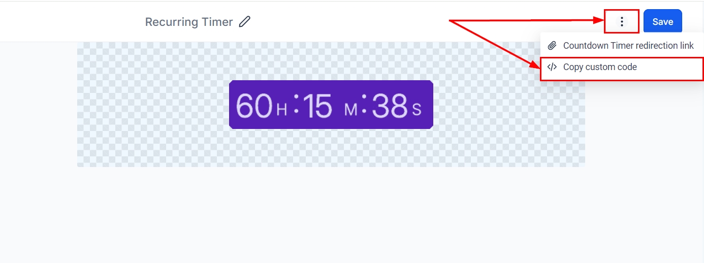 From the Countdown Timer section, click on the three dots in the list or edit view of the timer and copy the code.