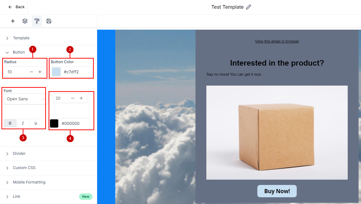 The Button section provides controls to customize the buttons in your emails, typically used as a Call to Action.