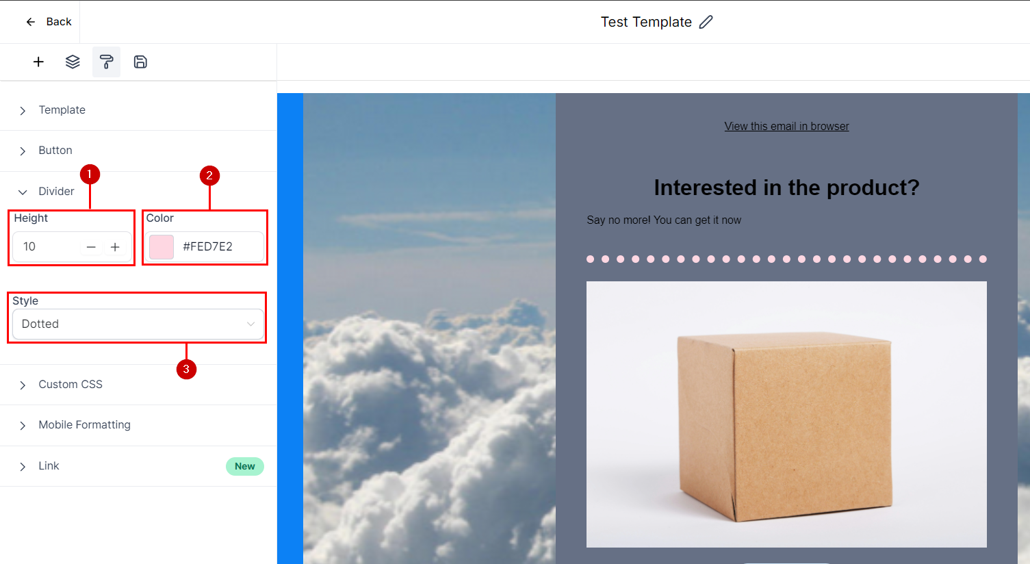 Style: You can choose between Solid, Dotted, and Dashed in the Style section. Selecting the right style helps you achieve the look and feel you desire for your email template.