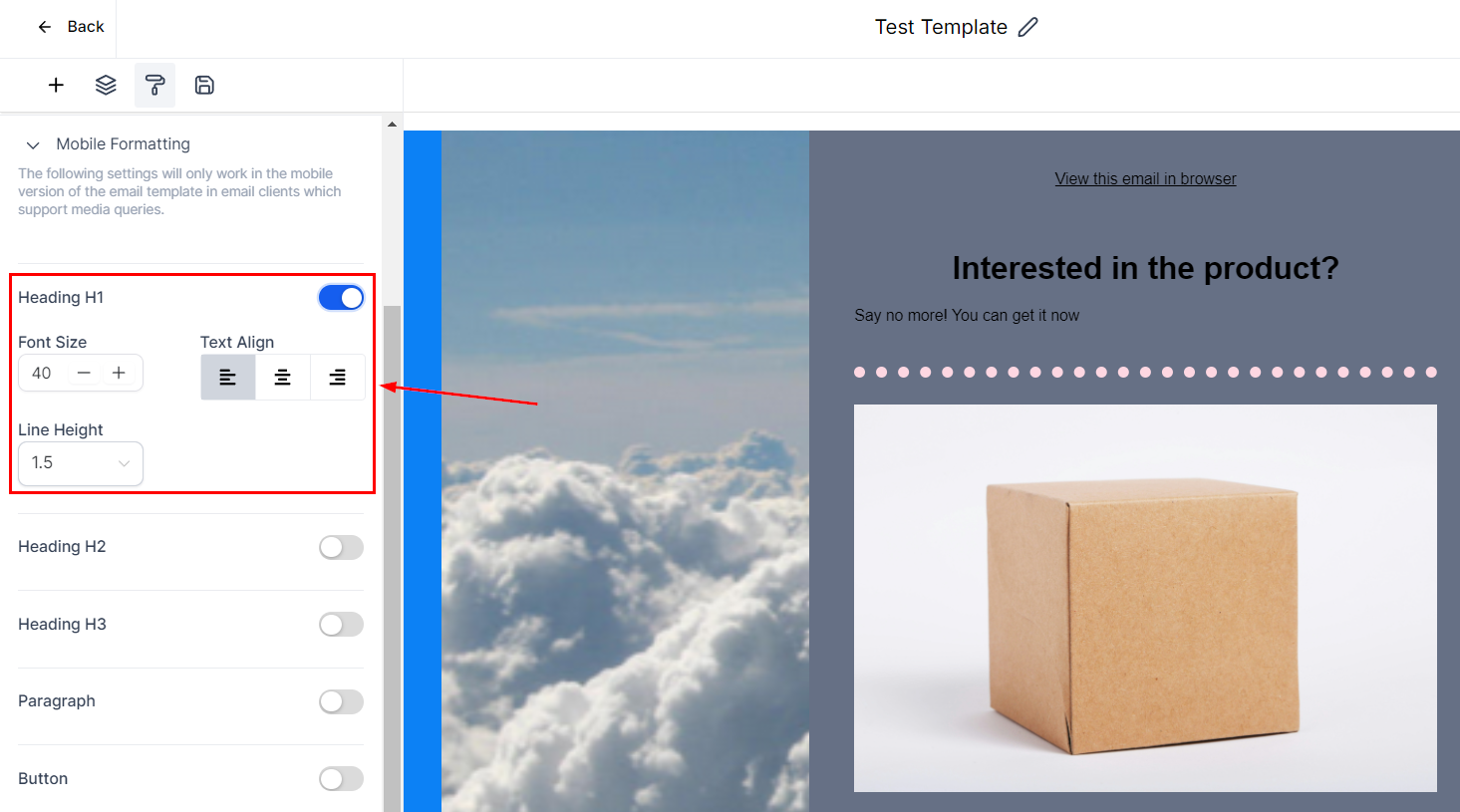 The following settings will only work in the mobile version of the email template in email clients that support media queries. There are options for different styles, such as font heights and alignment. For font size or button style, the toggle has to be enabled to apply for mobile formatting.