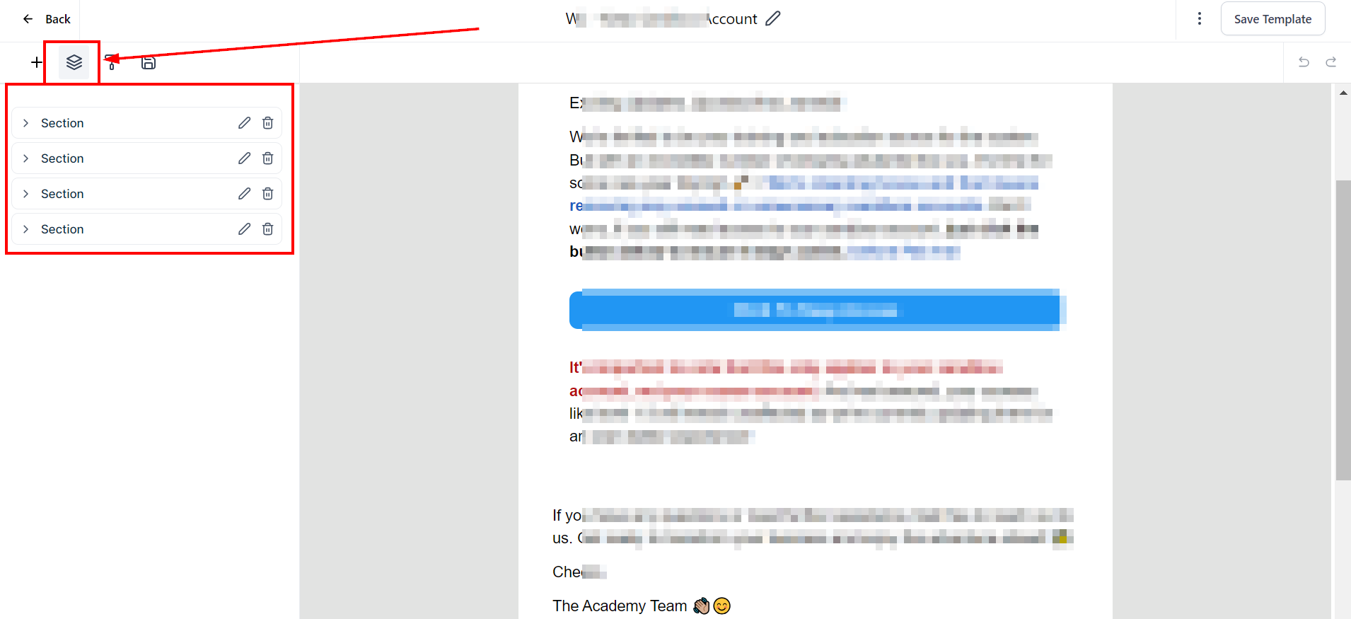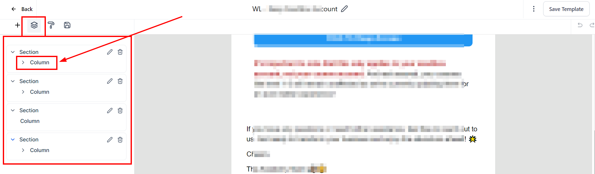 You will see a burger menu at the top left corner of the email builder. Once you click on that menu, you will see the Layer sections.