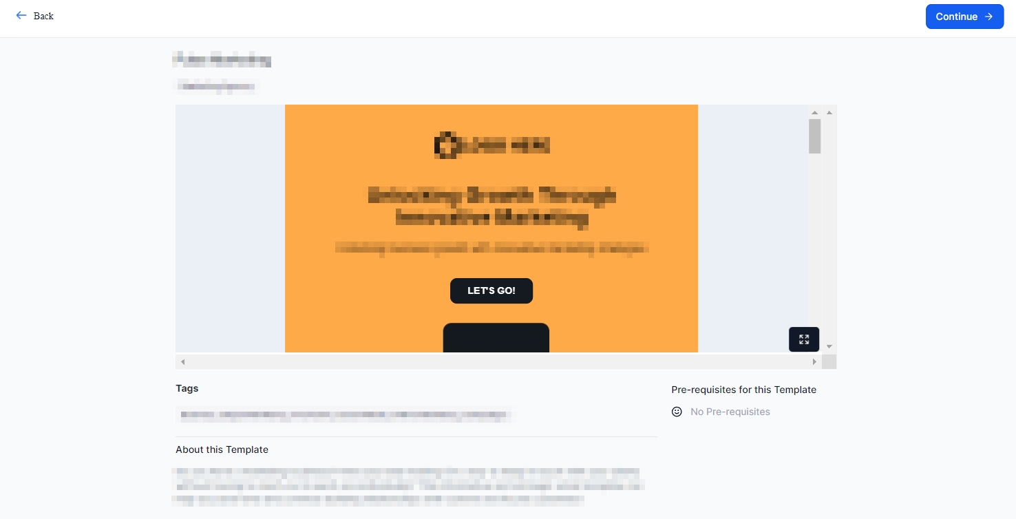 If you decide you want to use this template simply click on Continue, this will download the template in the system so you can start using it. The download will take a few seconds and then the email editor will open up for you to customize and use your template.