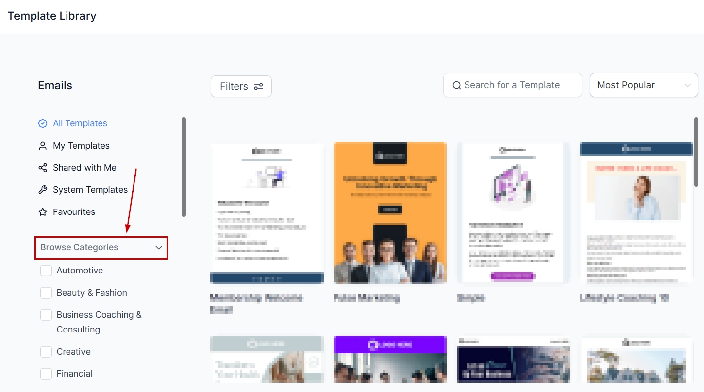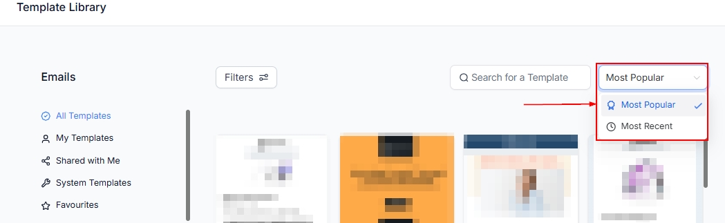 You can browse templates in different categories. All Templates will have all available results, My Templates will show you only templates you've created or uploaded, Shared With Me will be for any templates other people share with you, System Template will be the default templates available to everyone inside the CRM, and Favourites will include all your Starred Templates.