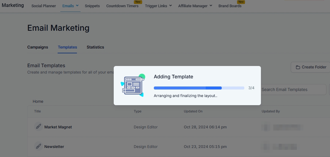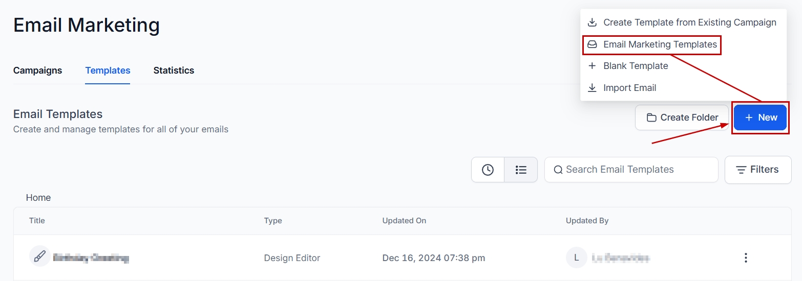 Click on New and select Email Marketing Templates, there you will have access to your Email Template Library where you can find all templates available to you.