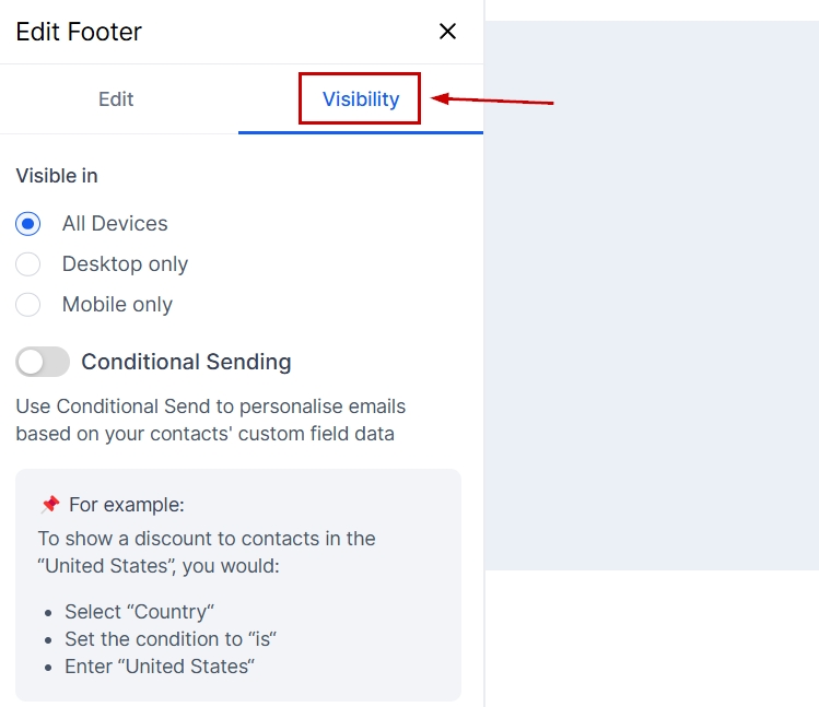 Switch to the Visibility tab to manage how and when to include the footer in your emails.