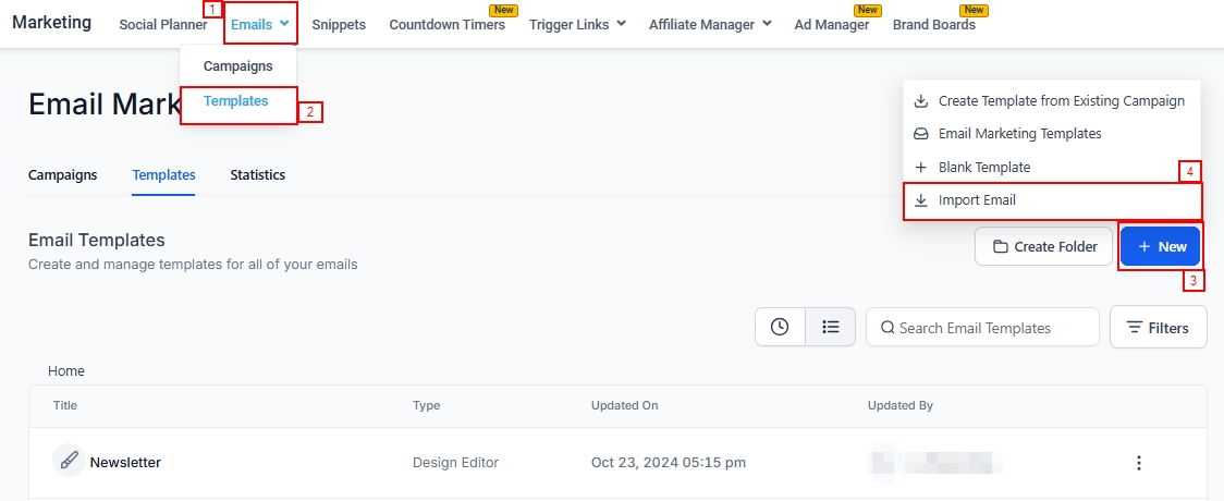 Once logged in, look at the left-side navigation panel and find Templates. Click it to access your saved email templates. Don’t see a design? You can create a new one here.