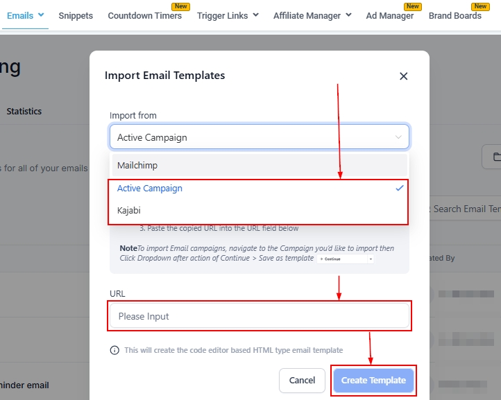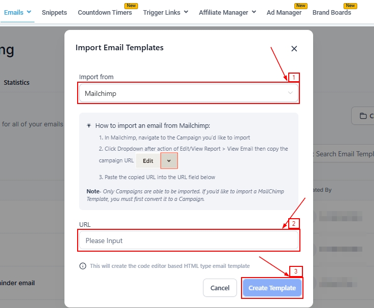 Next, Input the URL gotten from your Mailchimp account, then click on Create Template to proceed.