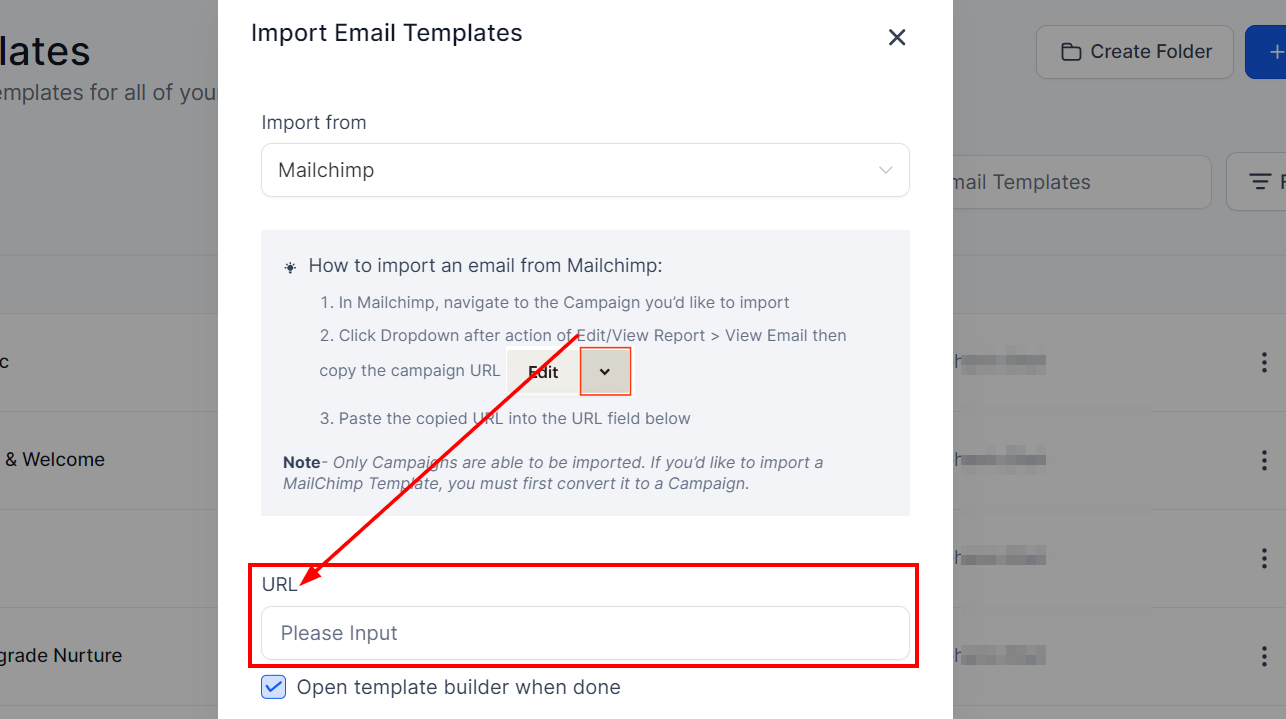 📌 Note: Only campaigns can be imported. To import a Mailchimp template, it must first be converted into a campaign.