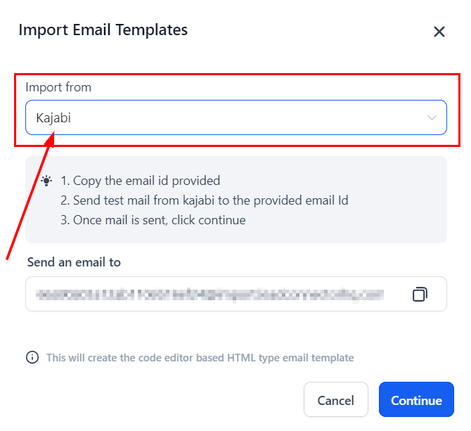 Next, copy the dynamic email ID provided and send the template you wish to import as a test email or campaign to this email ID from your Kajabi account.