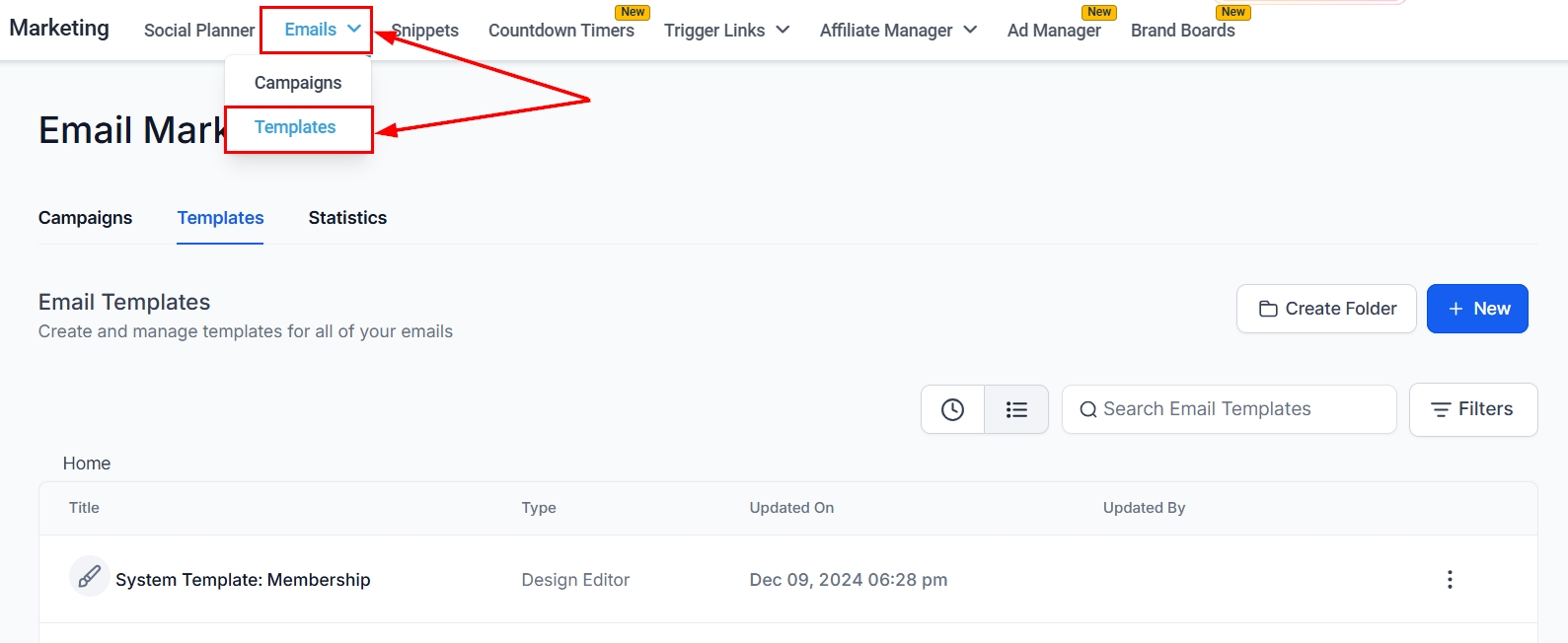 Go to Marketing > Emails > Email Templates in your CRM account. This is where you can create, manage, and import email templates for use in your campaigns.