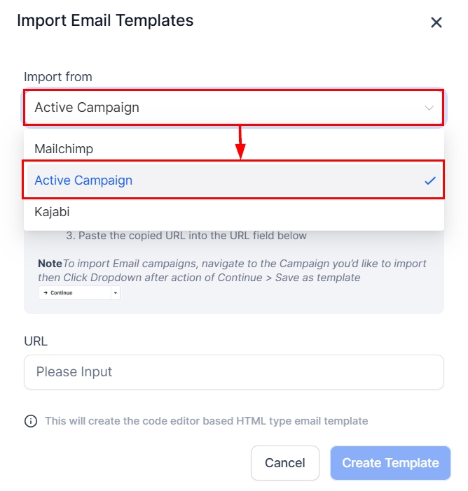 Paste the URL you previously copied from the ActiveCampaign template or campaign into the designated URL field.