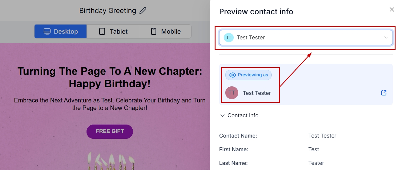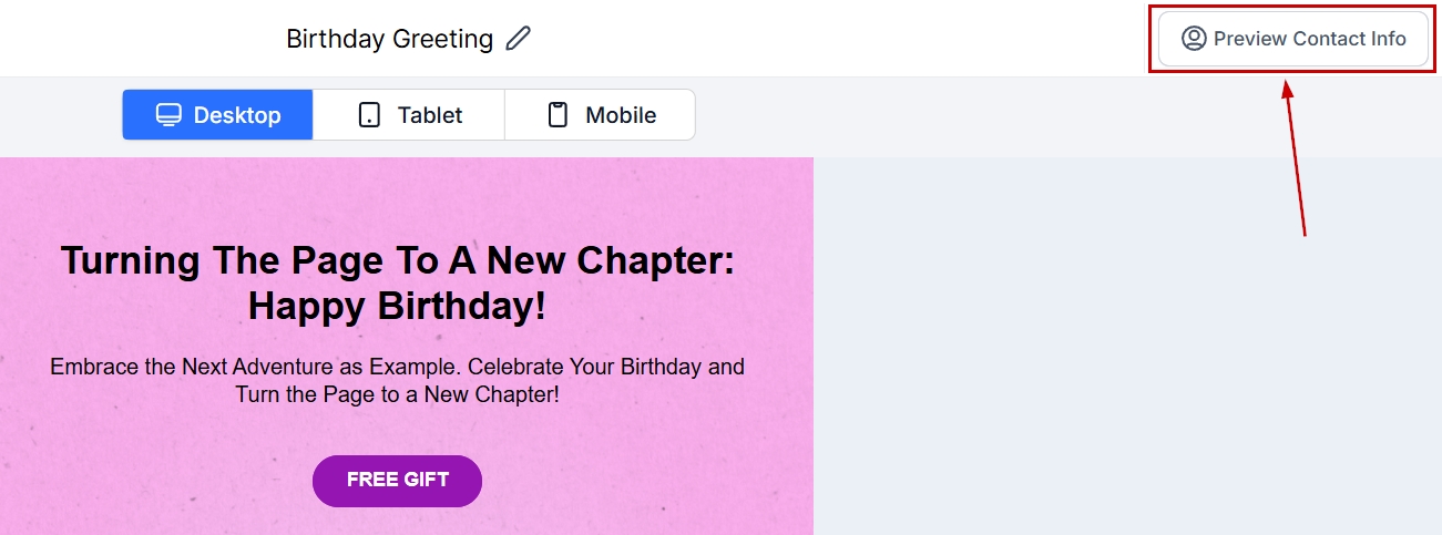 In preview mode, click Preview Contact Info to select a specific contact from your CRM to see how custom fields (e.g., first name, phone number, address) will populate the email.