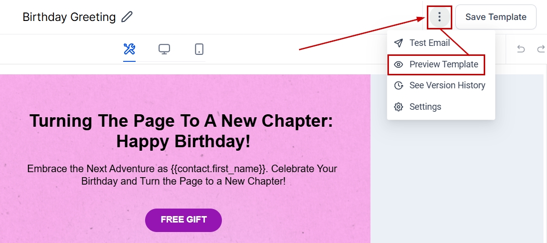 Click the three-dot icon on the top right-hand side and click “Preview Template” to see how the email will appear to recipients.