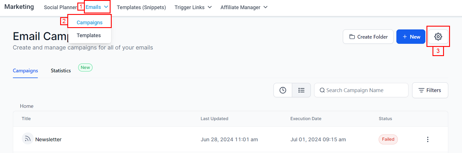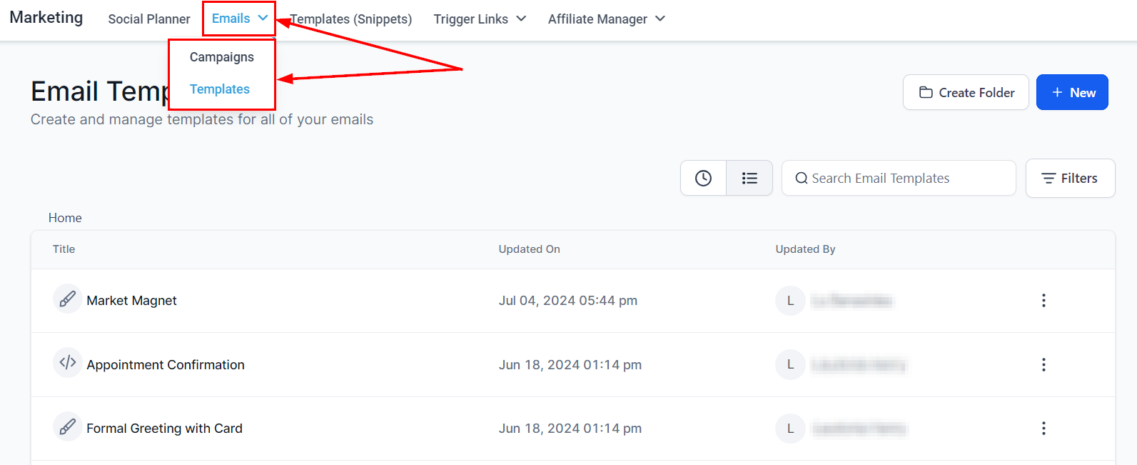 Go to Marketing -> Emails, then access the Campaigns or Templates section.