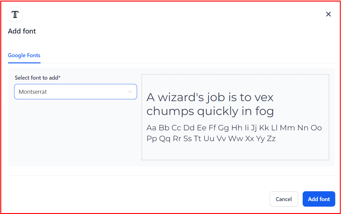 Seamlessly add a new font from this modal by selecting the Add font button.