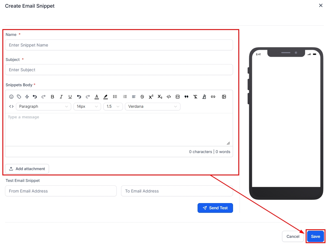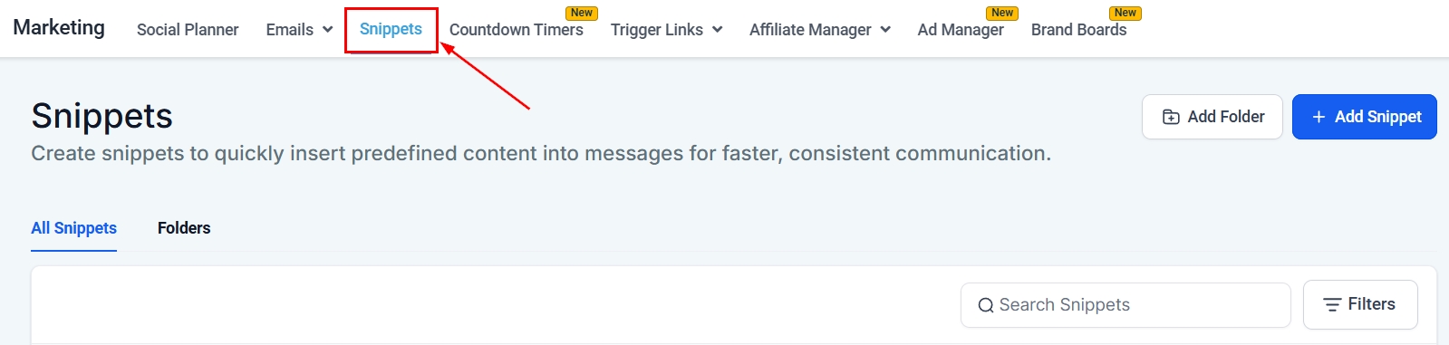 The Snippets section under the Marketing tab allows you to craft text messages and email templates, streamlining your team's ability to rapidly address common inquiries regarding your products or services. It is important to note that templates remain uniform across the entire CRM, and you can modify them in both Email Marketing and Conversations sections.