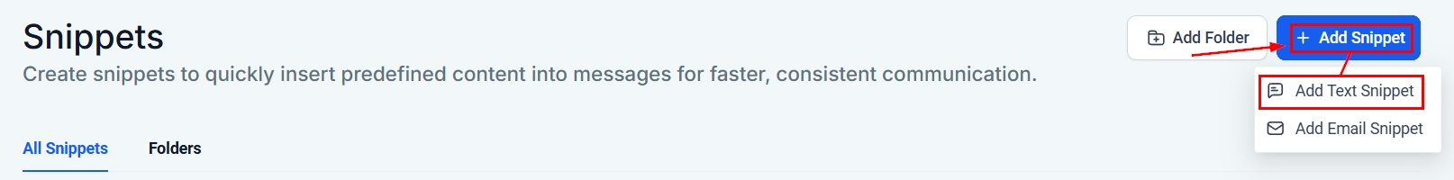 These snippets allow you to send and respond to SMS, Facebook DMs, Instagram DMs, and short chat messages in general. To create them click +Add Snippet and select Add Text Snippet.