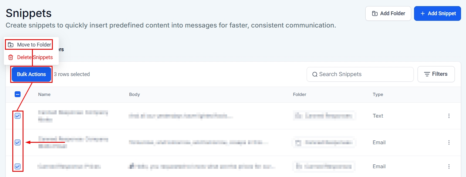 Once a snippet has been created you can click the three dots icon next to it to move, edit, duplicate, or delete the template.