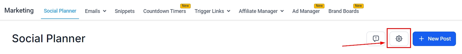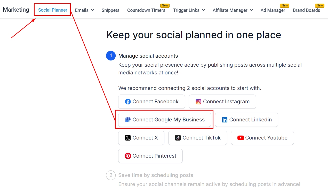 To get started, log into your account go to the Marketing tab, and click on Social Planner. If you haven’t connected to any social accounts yet, you will have the option to select GMB from the icons.