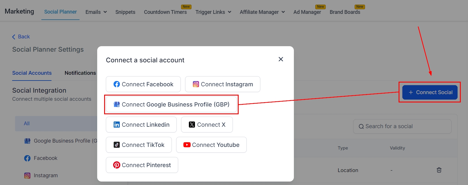 The next step is to click on the "Connect Social" button as shown below to manage multiple GMB locations. Once you’ve clicked on it, you will see the option to add the GMB locations select it, and connect the account(s).