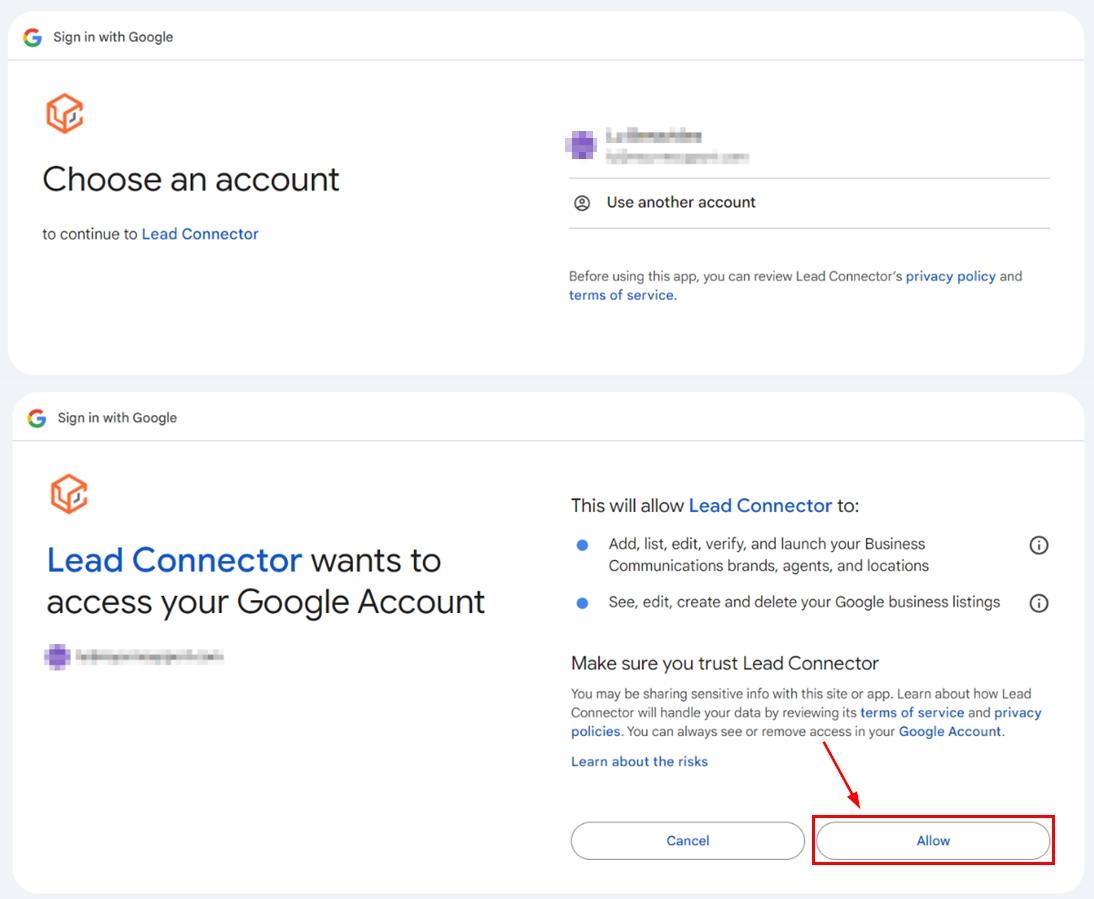 You will then be prompted to choose the Gmail account your GMB pages are linked to and provide Lead Connector with the permissions for connecting with the social planner. Choose the GMB locations you would like to add and click allow.