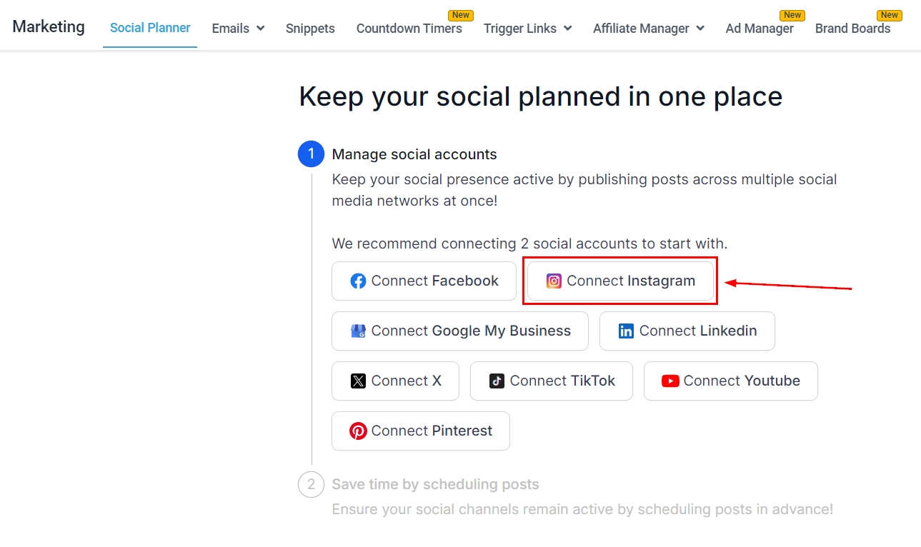 If you haven't connected any social media accounts, click the Instagram icon in the wizard with the Connect option to begin setting up.